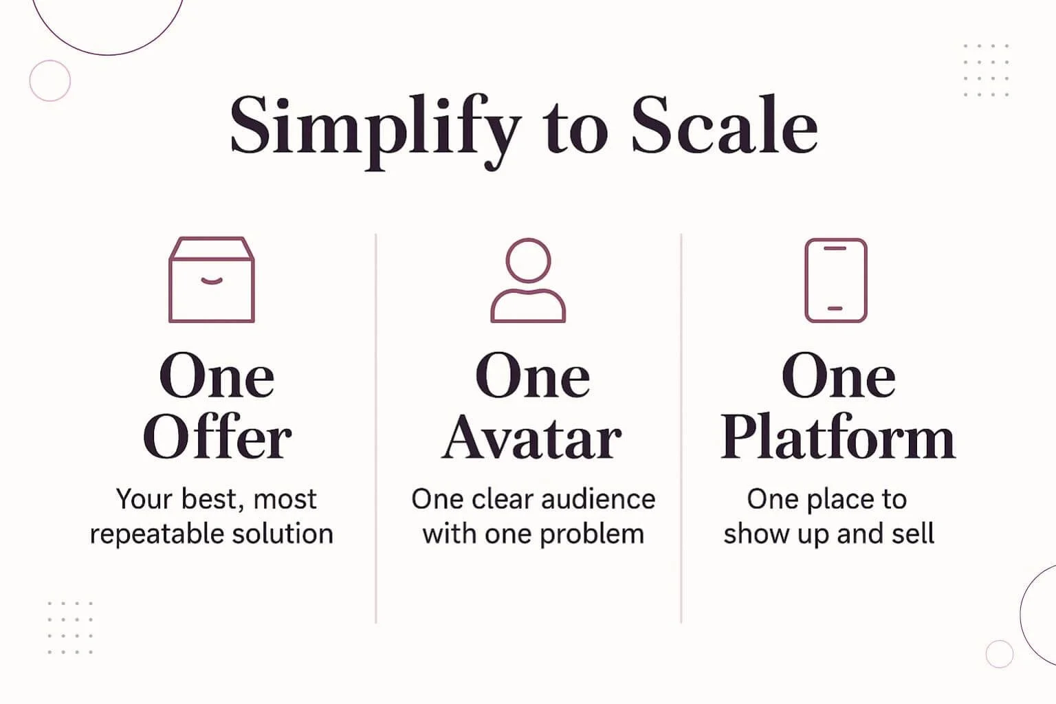 Define one offer, one avatar, and one platform to build traction faster and become known for solving a specific problem.