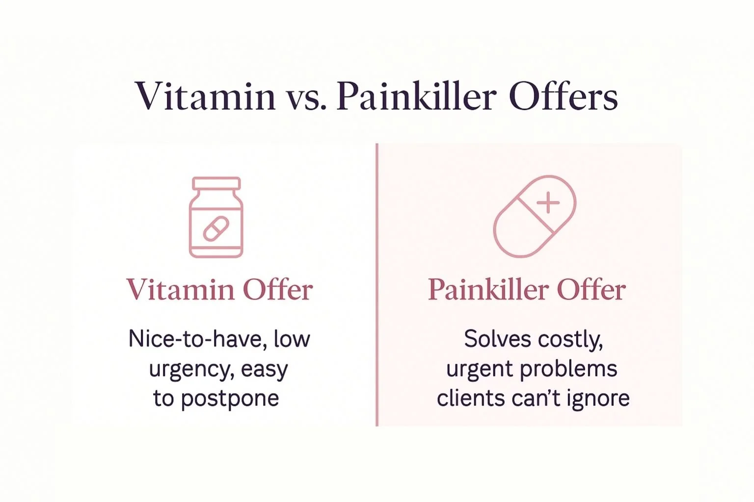 Painkiller Offer: Fixes a pressing issue that’s hurting results now. Example: bottlenecked operations, a leaking sales funnel, stalled growth despite strong demand.